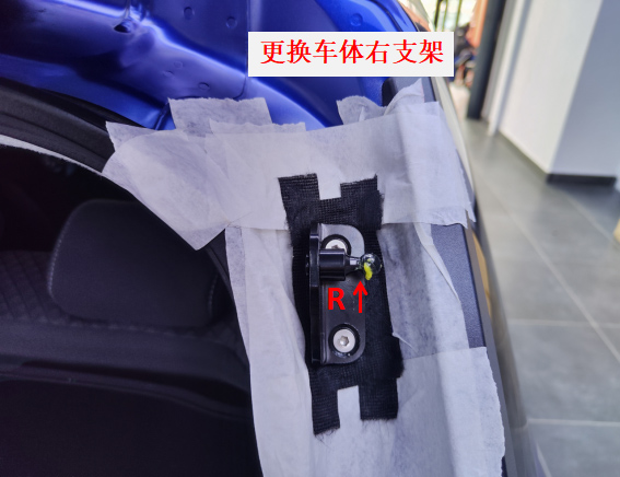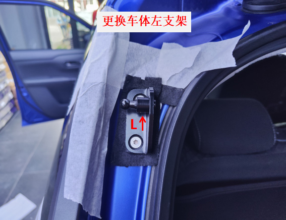 6、更換車(chē)體左支架(支架貼紙箭頭指向合頁(yè)鉸鏈,左右一樣)。