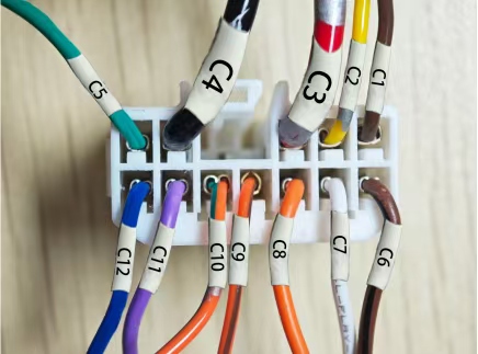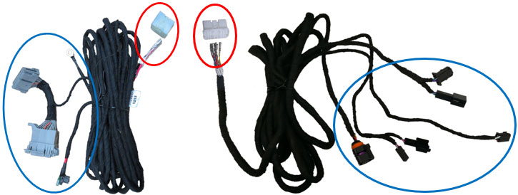 ● 部分線(xiàn)束的端子在出廠(chǎng)時(shí)尚未插膠殼(如下圖紅色圈內的端子) ,布好線(xiàn)束后為了避免端子碰在一起短路,穿完線(xiàn)束后需先插膠殼,再將線(xiàn)束其它插頭(如下圖藍色圈內的插頭)與原車(chē)插頭對插;